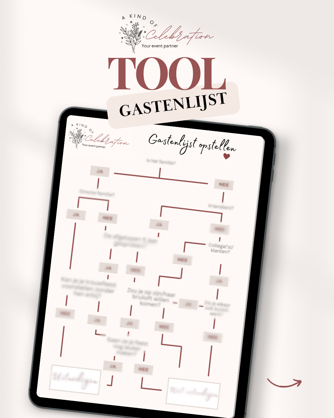 Met mijn gratis beslissingsboom krijgen jullie een handige tool die stap voor stap helpt om duidelijkheid te scheppen. Beantwoord eenvoudige vragen en ontdek wie écht niet mag ontbreken op jullie grote dag.